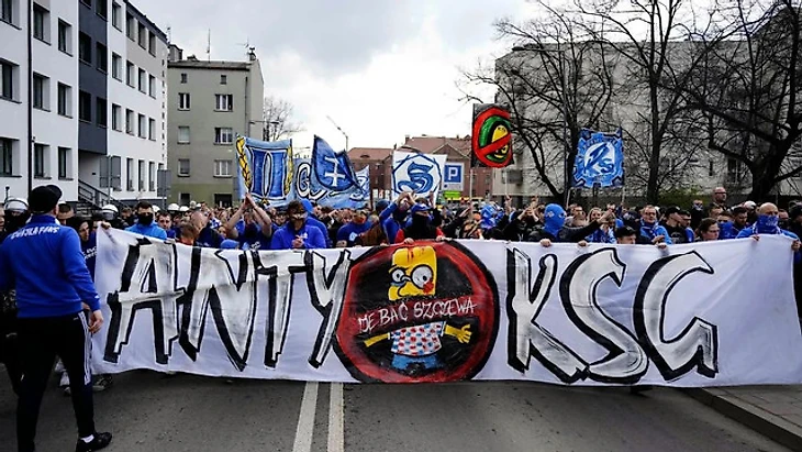 Начнём с Польши, где в дерби Верхней Силезии сошлись хожувский «Рух» и «Гурник» из Забже. Про криминальные дела хулиганов «Руха», за что были арестованы больше сотни людей, я уже подробно рассказывал ТУТ. В ходе этих разборок от рук «Psycho Fans» немало пострадали фанаты «Гурника», так как между двумя фанатскими лагерями уже много лет идёт самая настоящая война. Перед матчем обе стороны отметились уличными акциями: кибицы «Руха» общим маршем прошли до обновлённого стадиона «Шлёнски» – с недавних пор «синие» выступают именно там. На лицевом баннере, который они несли в первом ряду, было перечёркнутое изображение избитого Барта Симпсона в майке «Гурника». Про него мы ещё сегодня обязательно вспомним.