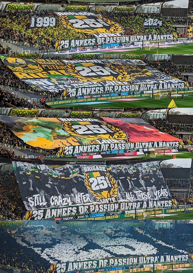 Во Франции бились за выживание 2 аустайдера – «Нант» и «Страсбург». Для фанатов хозяев этот поединок был важен вдвойне, так как, помимо важности игры с турнирной точки зрения, они решили отметить 25-летие свое ультрас-группы «Brigade Loire». Они презентовали сразу 5 очень мощных перфомансов под общим лозунгом «25 лет страсти ультрас «Нанта»!».