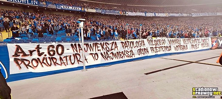 Также нельзя не отметить баннер «Статья №60 – величайшая патология польской судебной системы. Прокуратура – крупнейшая преступная группировка, поддерживаемая полицией». Баннер посвящён статье №60 в польском уголовном кодексе, согласно которой тот, кто будет сотрудничать со следствием и давать показания на своих подельников, может избежать уголовного преследования. Вот уже несколько лет для польских фанатов это является огромной проблемой, из-за которой многие получают непомерные сроки, а кто-то и вовсе сидит месяцами в СИЗО просто так – спустя год или больше их выпускают, так как доказать сказанное «стукачами» следователи попросту не могут. Ну а с кого началась вообще такая практика и как человек, бросавший ножом в Баджо, недавно стал самой ненавистной фанатской фигурой Польши, читайте в отдельной статье.