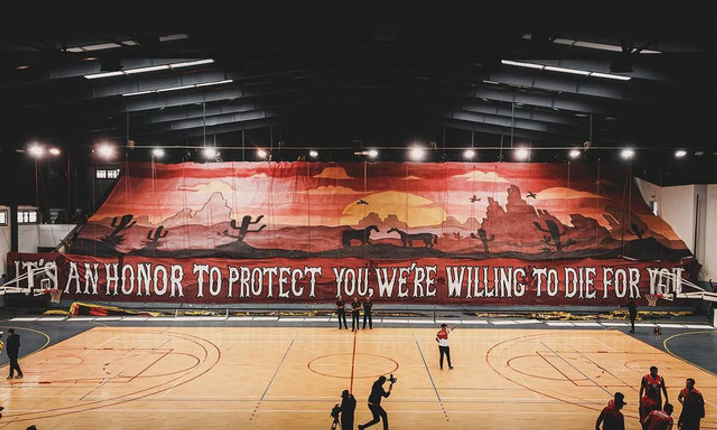 А затем развернули огромный баннер во всю трибуны с пейзажем дикого запада и текстом «Для меня большая честь защищать тебя, мы готовы умереть за тебя!».