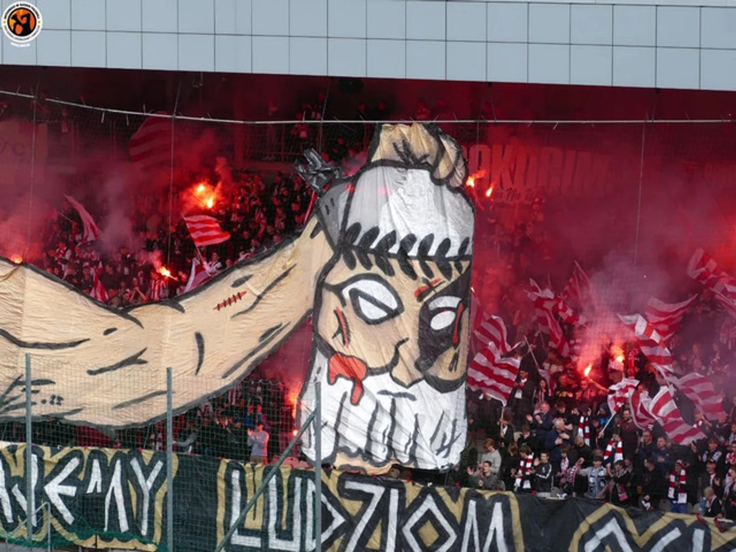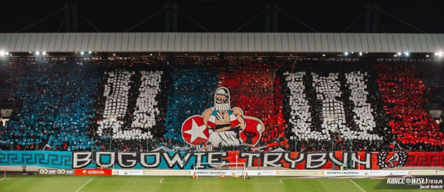 Снова ничего непонятно? Поясняю: это – голова «Бога трибун» из одного из предыдущих перфомансов фэнов «Вислы». Подпись, собственно, так и гласит: «Трибуна Бога», а фоном из плашек выложены буквы «U» и «W», то есть первые буквы группировки «Ultras Wisla».