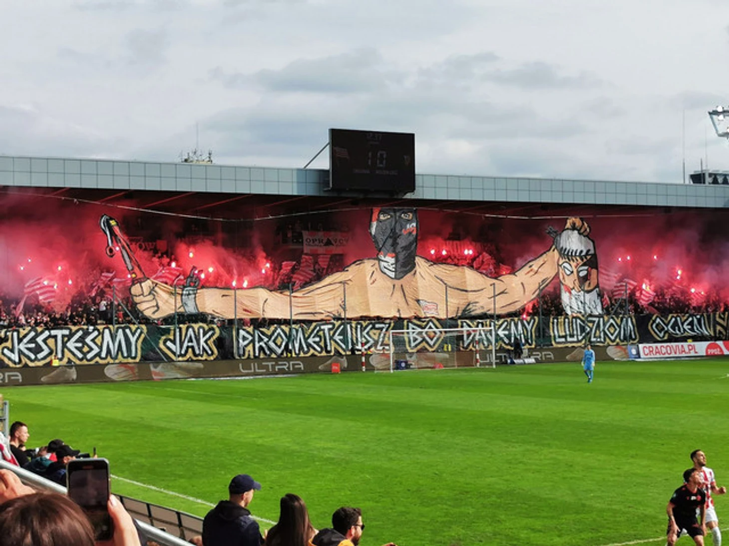 Раз сегодняшний обзор мы начали с Польши, то предлагаю Польше и и закончить, закольцевав тем самым наше виртуальное путешествие по стадионам Европы. Итак, матч «Краковия»–«Видзев». Кибицы «краксы» презентовали необычную оправу с текстом «Мы как Прометей, потому что даём людям огонь!». На самом же баннере был нарисован фанат «Краковии» в маске, который держит в руках отрубленную голову и предмет, похожий на нож. Но всё-таки это файер – не зря же в тексте хорео сказано про Прометея и огонь. Огонь, кстати, был реализован на трибуне с помощью пиротехники.