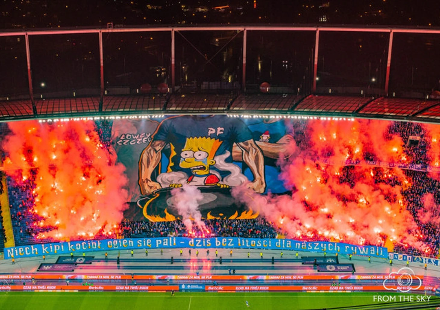 Второй их оправой стал баннер, на котором хулиганы «Руха» в футболках бригады «Psycho Fans» варят в котле в аду плачущего Барта Симпсона. Огонь при этом был вполне настоящим, так как на трибуне горели несколько десятков файеров. Текстовик под всем этим гласил «Пусть горит огонь и кипит котёл – сегодня без пощады к нашим соперникам!». Ну а «издеваются» фанаты «Руха» над мультяшным героем не просто так – ультрас «Гурника» сами много лет используют его образ в своих перфомансах, баннерах, стикерах и футболках, так что в Польше Барт Симпсон = «Гурник» (Забже).