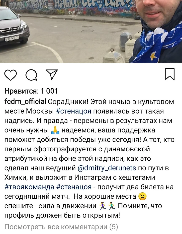 Официальный инстаграм футбольного клуба «Динамо» приветствуют акт вандализма и обещали подарить билеты на сегодняшний матч с «Краснодаром» тем, кто первым выложит фотографии с динамовской атрибутикой на фоне этой надписи. «На хорошие места» – подчеркивают представители клуба.