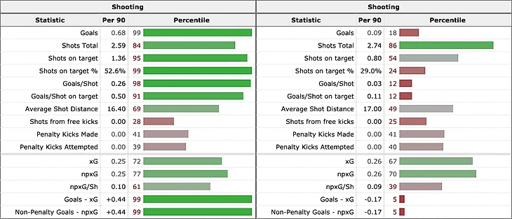 Статистика говорит, что бьёт, даже больше, чем в прошлом сезоне, и практически с той же дистанции — в среднем всего на 60 см дальше от ворот. xG/90 Мейсон выбивает столько же (разница в 0,01), но процент ударов в створ упал с 52,6% до 29%.