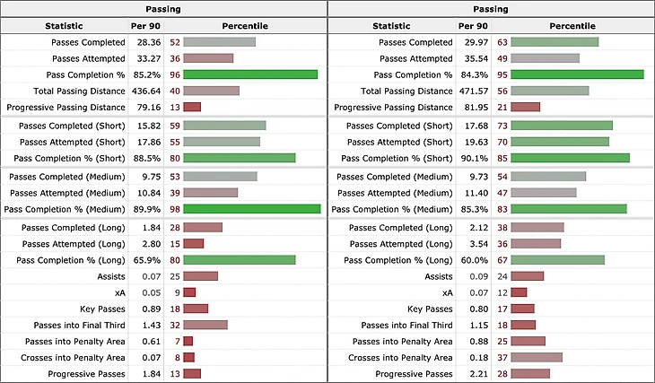 Перцентиль — простыми словами, процент игроков, которые хуже анализируемого по данному показателю. Например, перцентиль Мейсона по xA в прошлом сезоне — 9, это означает, что 9% игроков Лиги имеют такой же или худший показатель xA, чем он. Следовательно, ~90% игроков Премьер-Лиги в прошлом сезоне создали для партнёров больше шансов, чем Мейсон.