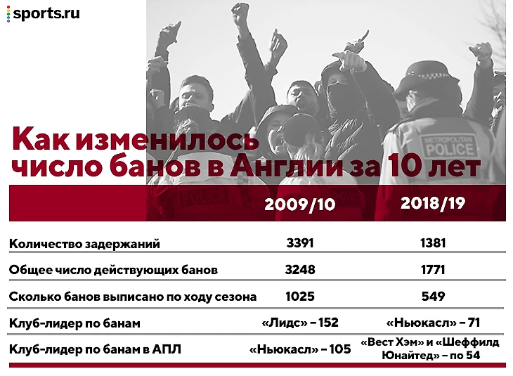 • За 10 лет количество задержаний на английских стадионах упало почти в 2,5 раза, а банов (и действующих, и выписанных по ходу сезона) стало примерно в 2 раза меньше.