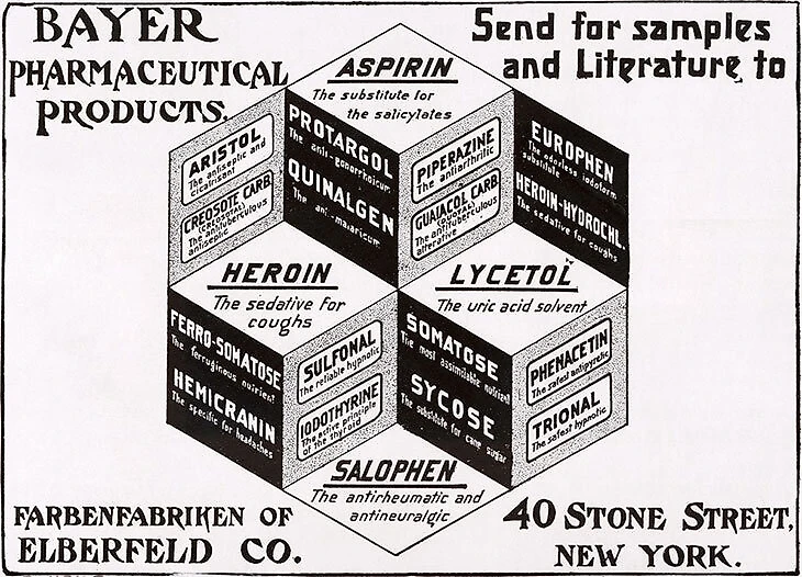 Сегодня это название пишется с маленькой буквы, а этим словом называется один из самых смертоносных наркотиков в человеческой истории. Но в 1898 году компания Bayer вывела на рынок Heroin как торговую марку нового лекарственного средства, которое безрецептурно продавалось потребителям главным образом в качестве обезболивающего и средства от кашля.