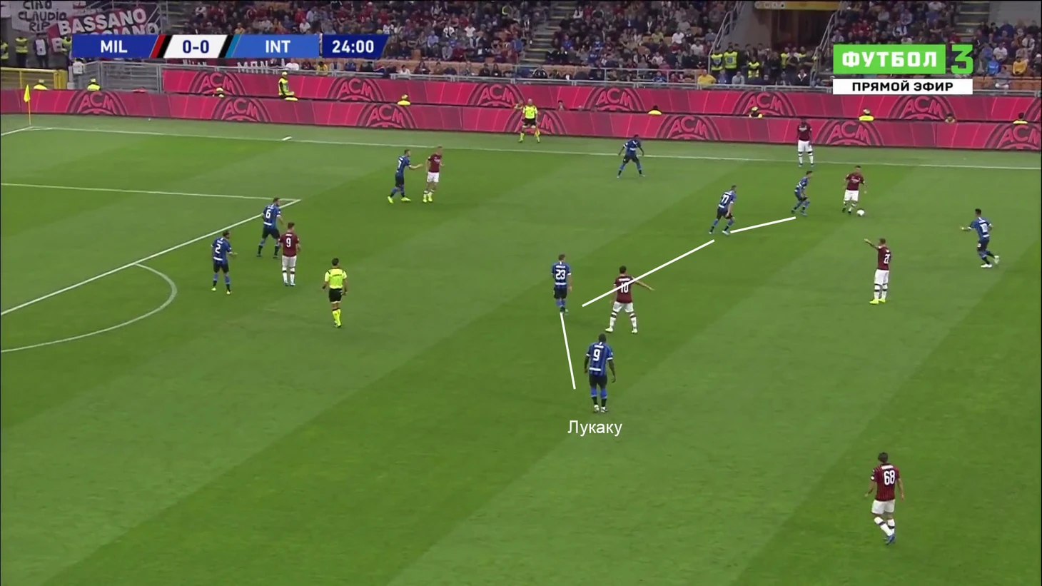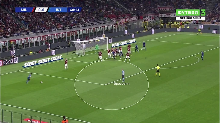 Открыть счет помог хитрый стандарт. Похоже, на очередную наработку Конте: Брозович сначала стоял у мяча вместе с Сенси, а затем побежал на границу штрафной, где получил свободу. «Милан» мог среагировать лучше, но именно наработка поставила их в ситуацию, где нужно реагировать (рано или поздно такие ситуации ведут к ошибкам):