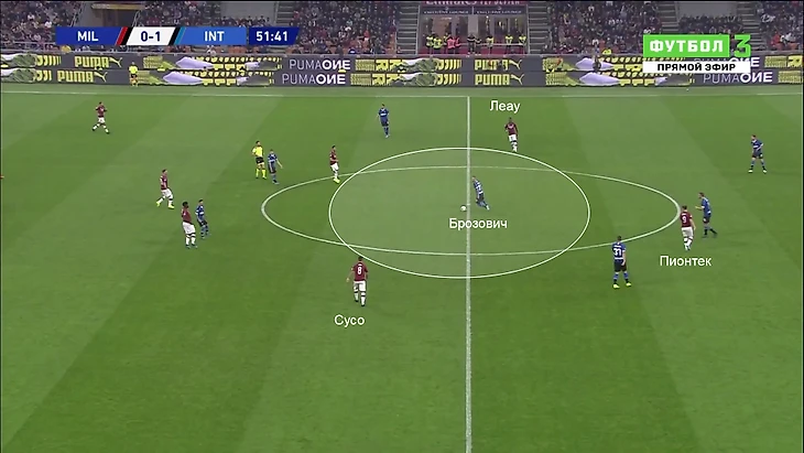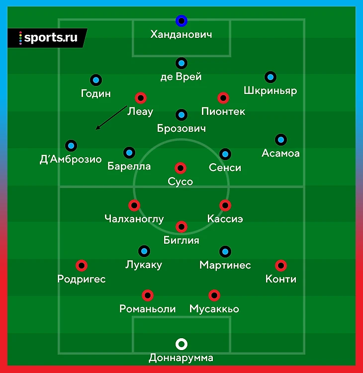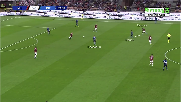 Де Врей сыграл через оттянувшегося Стефано Сенси. Он получил лишнюю секунду свободы, потому что Кессиэ разрывался между центр и флангом. Сенси легко передает мяч свободному Брозовичу – прессинг разбит: