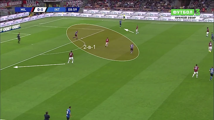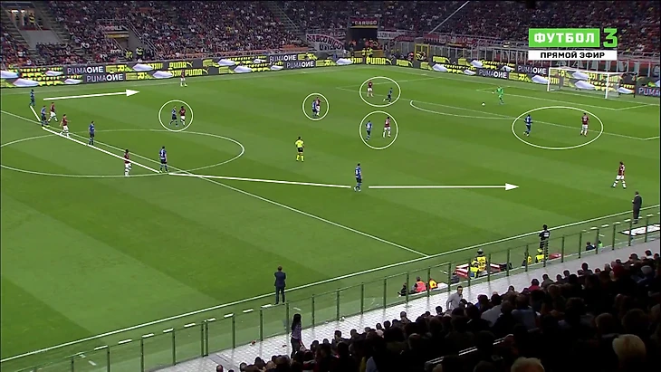 Обратной была ситуация при прессинге «Милана». По схеме, Сусо должен был одновременно давить на Стефана де Врея и Марцело Брозовича. Плюс крайние защитники не поддерживали давление и были очень глубоко – следовательно Франк Кессиэ и Хакан Чалханолгу разрывались между помощью в центре и давлением на флангах. Это приводило к легкому продвижению «Интера».