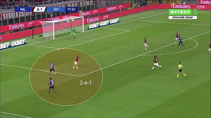 «Интер» сел поглубже и отдал мяч. Но скоро проявился контраст в том, как тренеры читают игру. Конте изучил новую схему «Милана» и ответил переходом на 3-4-2-1: вместо Лаутаро Мартинеса вышел Маттео Политано, Николо Барелла и Политано играли под Лукаку. Главное отличие – у «Интера» стало по два фланговых игрока. У «Милана» из-за высокой позиции Сусо и Пакета фланговые защитники оставались без страховки.