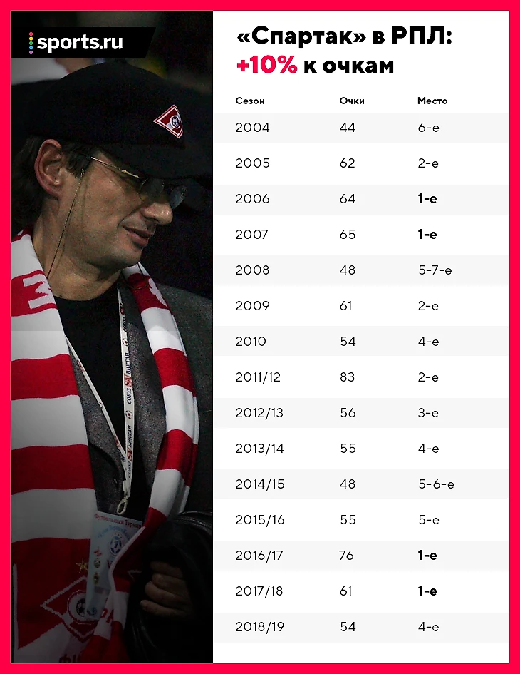Даже если мы пойдем путем Федуна и возьмем цифру в 10%, полнейший идиотизм считать такое влияние чем-то незначительным. Простейший способ это проверить – добавить 10% к очкам «Спартака» за каждый сезон: