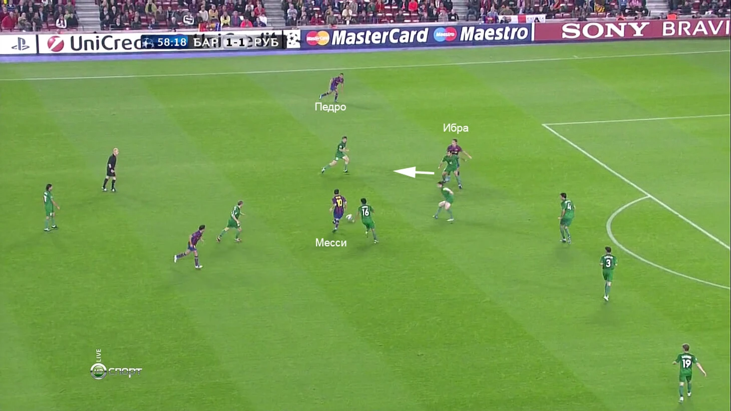 Здесь менее вопиющая с точки зрения остроты ситуация, но она тоже хорошо подчеркивает нехватку взаимопонимания. Месси хочет отдать на Педро, который в случае успешного паса готов ворваться в штрафную. Пас перехватит Ибра – он не сможет обработать мяч (логично, ведь не ему предназначался) и снова загубит атаку:
