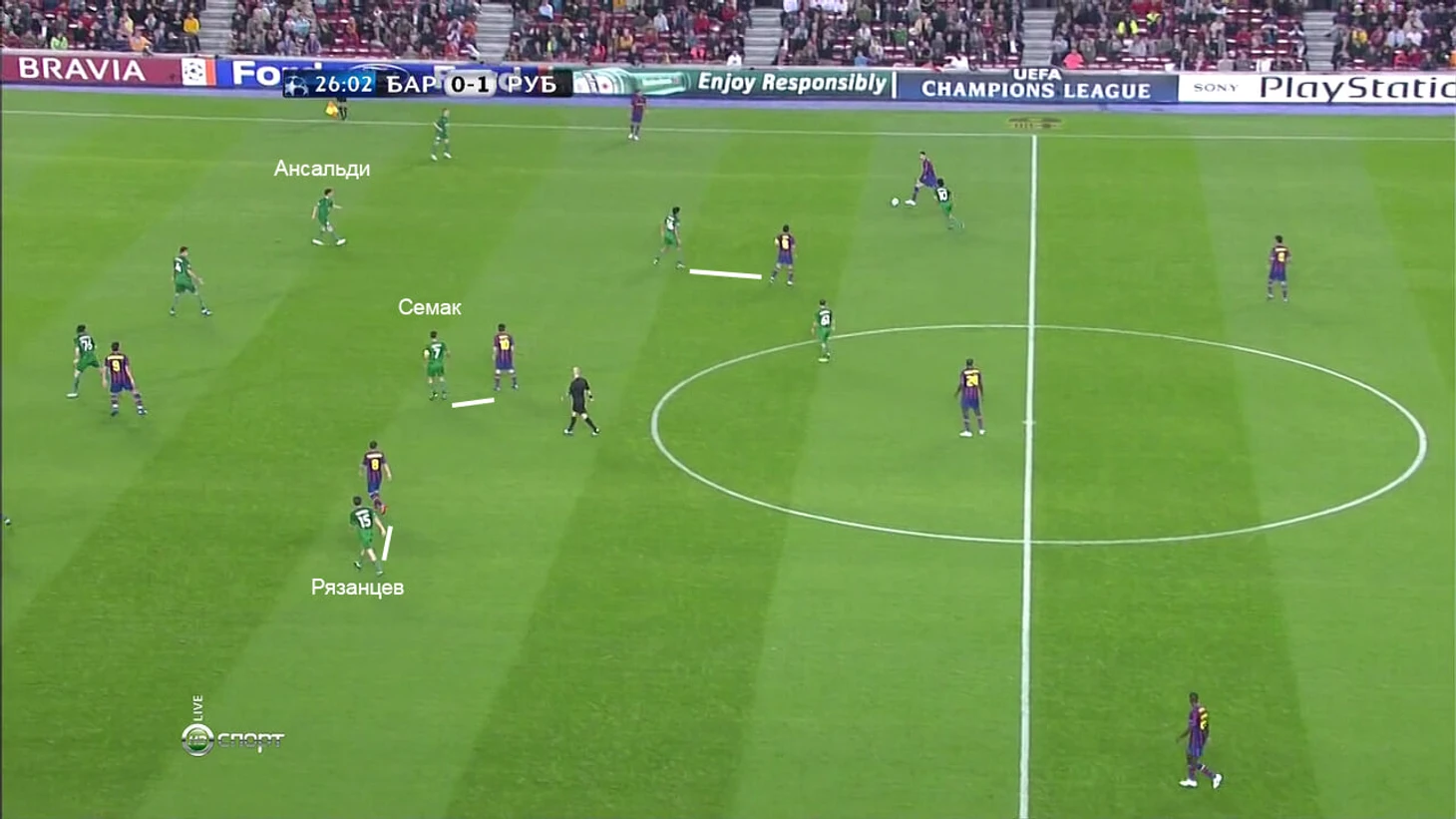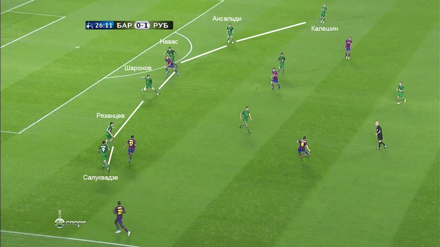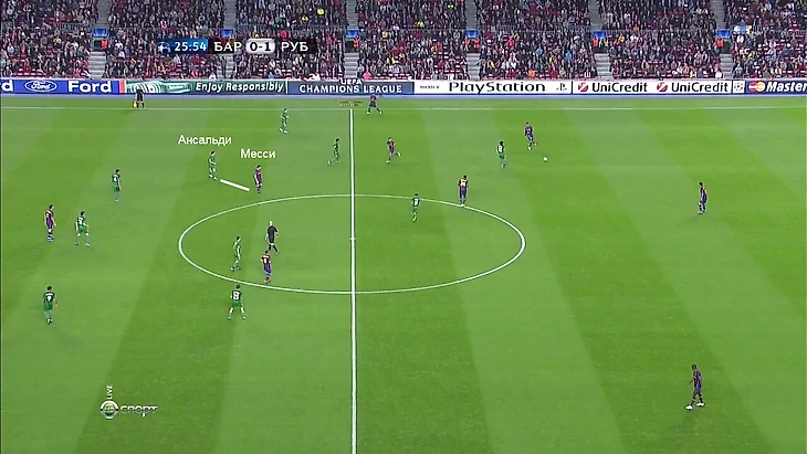 Далее, убедившись, что Рязанцев пришел в центр для помощи, что теперь есть кому передать Месси (в данном случае Сергею Семаку), Ансальди возвращается в линию защиты: