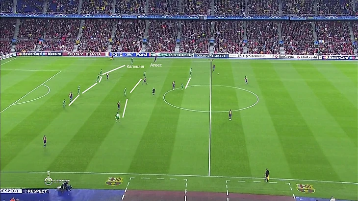 Даже когда Алвес оказывался так высоко, что становился дополнительным форвардом, «Барса» все равно не перегружала оборону «Рубина». Калешин просто опускался за ним и образовывал пятерку:
