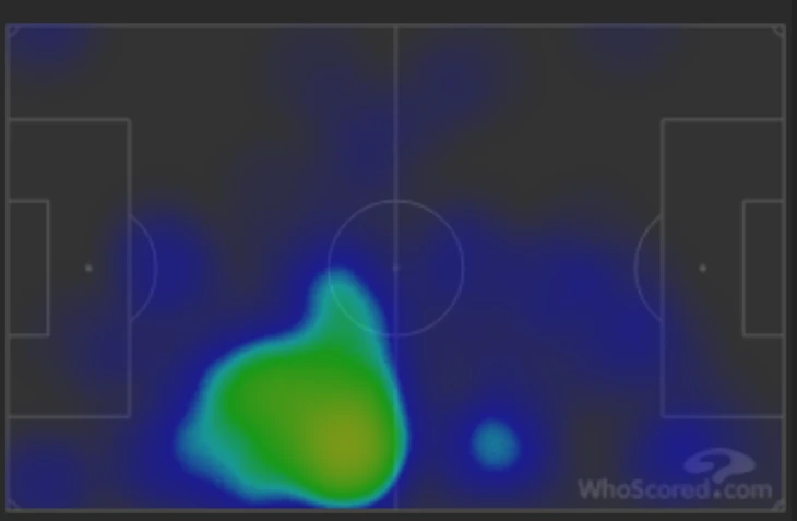 В действиях Папу Гомеса был явный перекос в эту более свободную зону. Фройлер тоже использовал этот прием (пускай он не так опасен при созидании). Вот совокупная тепловая карта этих двух футболистов – акцент хорошо заметен:
