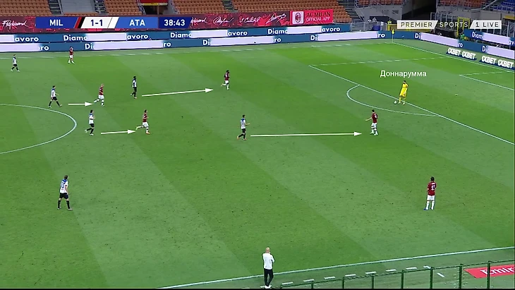 Например, важным было не выносить сразу, а сделать несколько передач, чтобы выманить игроков «Аталанты» повыше. Такое выманивание давало «Милану» больше простора в зоне, куда направлялся мяч, и больше шансов на подборе. Команда Пиоли играла просто, но осмысленно.