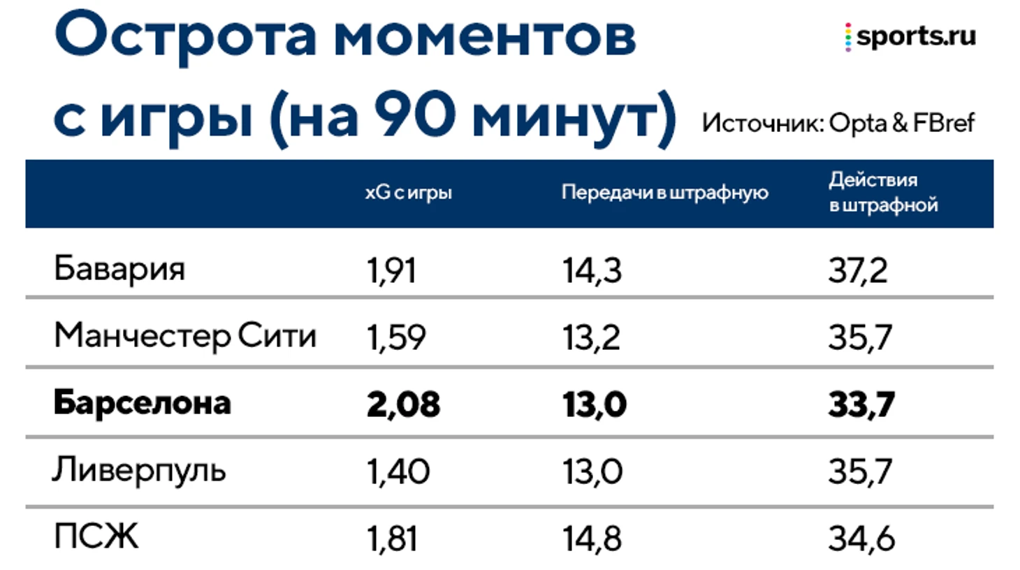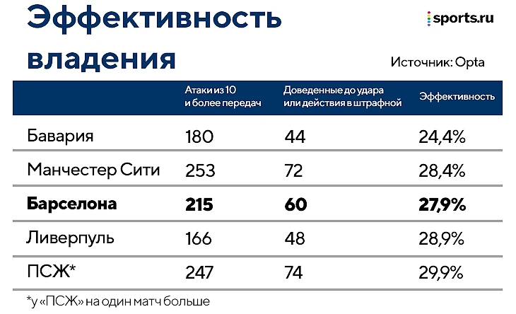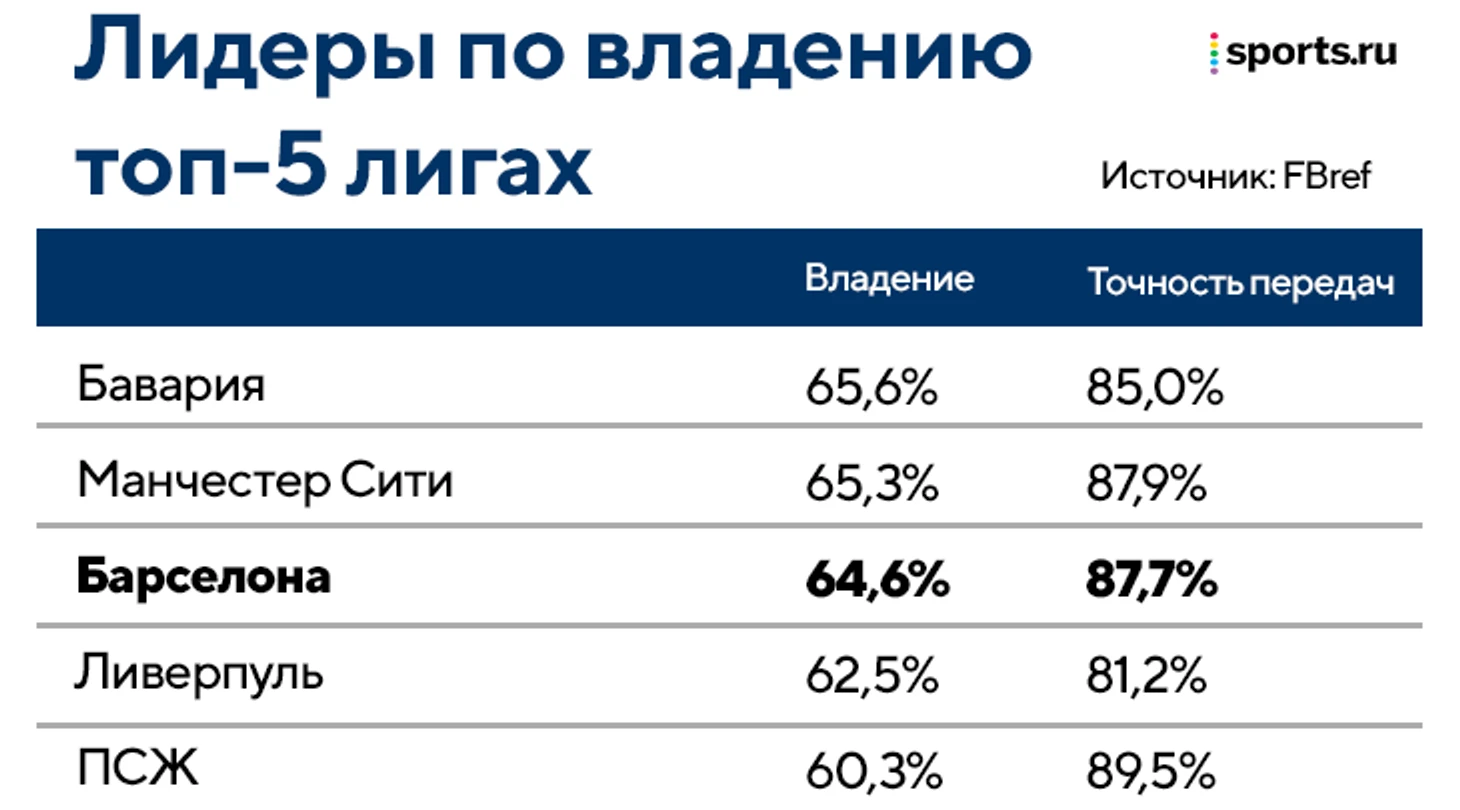 В позиционной атаке «Барса» тоже выглядит здорово. По владению команда Хави уступает только «Баварии» и «Манчестер Сити»: