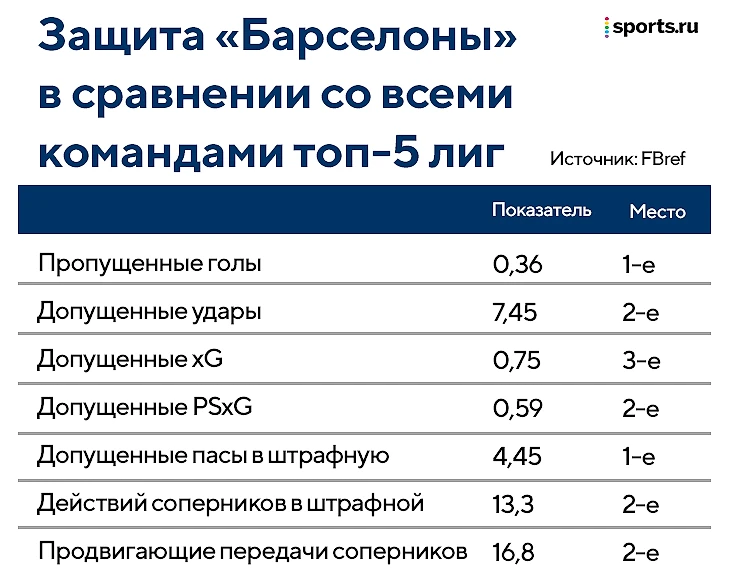 Второй индикатор мощи прессинга – допущенные моменты. «Барса» обороняется именно на чужой половине поля. В их случае надежная оборона – именно следствие качества прессинга. Защита команды Хави выделяется на европейском фоне: