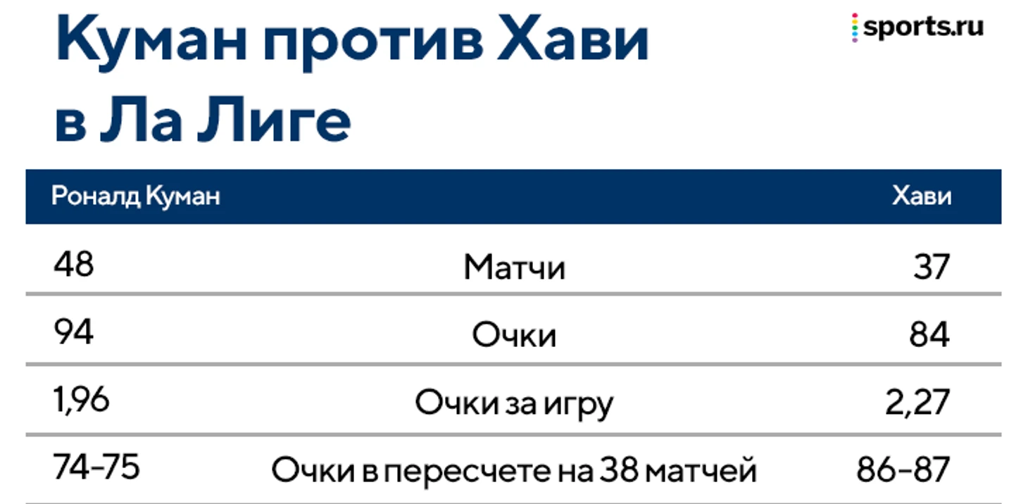 Простой способ ответить – сравнить результаты в Ла Лиге. Они не учитывают контекст: у Кумана в первый сезон был Лео Месси, а Хави получил команду в кризисной точке, но его (в отличие от Кумана) поддержали на рынке прошлым летом. Однако базовое представление об успешности против сопоставимых по уровню соперников такое сравнение даст: