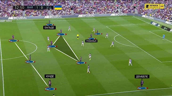 Выглядит примерно так – два центральных защитника + осторожный правый (Кунде); тройка для контроля в центре поля; правый вингер в широкой позиции (Дембеле); слева ширину создает фланговый защитник (Бальде); левый вингер в более свободной роли (Рафинья):