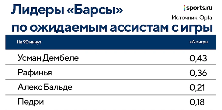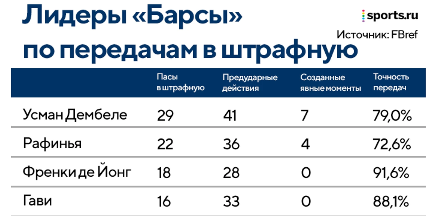 Такая же картина и по остроте созданных моментов – Рафинья и Дембеле два главных источника угрозы. Дальше – пропасть. Потом плотная группа игроков других позиций.