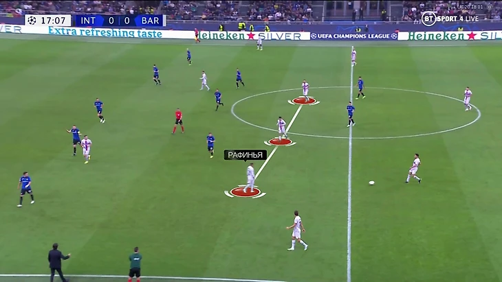Обратный пример – матчи против «Интера» (особенно первый). У соперника травмирован ключевой опорник Марцело Брозович. Ему нет прямой замены. На этой позиции наигрывают Хакана Чалханоглу. Логичный путь – надавить на эту зону и чаще направлять туда атаки. Путь «Барсы» – легендарные 50 навесов.