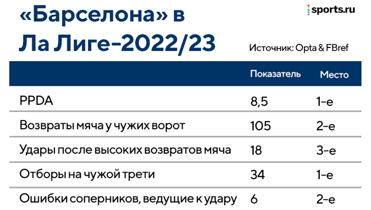 У «Барселоны» самая высокая интенсивность давления в Ла Лиге. Также команда в топе по высоким возвратам мяча, ударам после них, отборам на чужой трети: