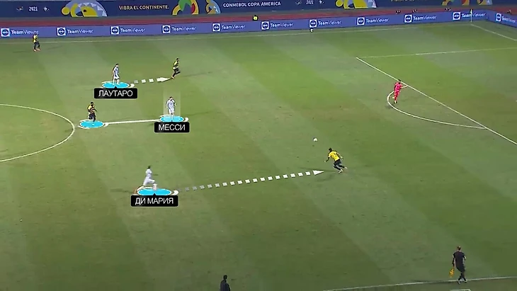 В другом случае мишенью для Месси выбирается центральный защитник. Это ведет к другим реакциям партнеров – на опорников выдвигаются Паредес и Де Пауль, а Ди Мария готов душить крайнего защитника: