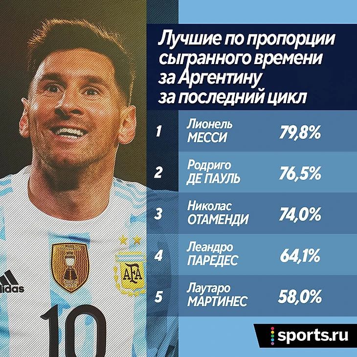 Месси не хочет терять даже мгновения товарищеских игр за Аргентину. Любые пограничные ситуации с его здоровьем решаются в пользу готовности играть. В прошлом сезоне за «ПСЖ» он провел лишь 63,0% от общего времени. В прошлом отборе к ЧМ – 55,6%. Раньше Месси получал удовольствие в «Барсе», а в сборной отдавал долг. Теперь все наоборот: отдает долг в клубе, а кайфует в сборной. Исключением может показаться статистика в «ПСЖ» в этом сезоне – 83,5%, но не секрет, что один из мотивов тут – зимний ЧМ, к которому нужно было подойти в оптимальной форме.
