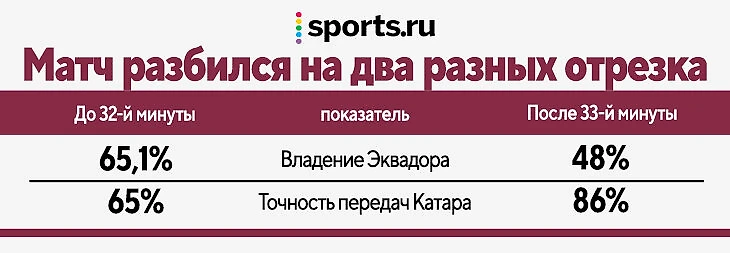 Проблема заключалась в том, что отрезок под контролем Эквадора имел нулевую смысловую ценность. В 60 с лишним минут уместилось два удара с игры (всего – три) и лишь одна толковая атака Катара (в конце первого тайма). Катар в новом рисунке ничего не мог предложить в стадии владения, а Эквадор экономил силы.