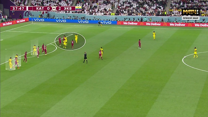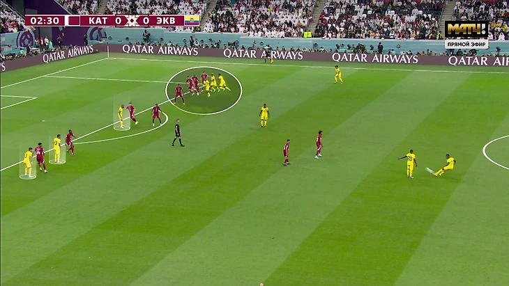 Еще один пример – 38-я минута. Между фолом и подачей теперь прошло 122 секунды (учтем, что была желтая карточка и болезненный для Эннера Валенсии стык). В плане замысла и количественного наполнения штрафной задумка у Эквадора та же: