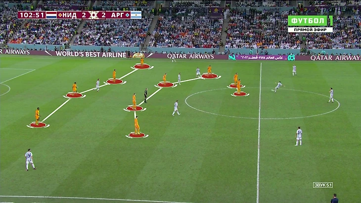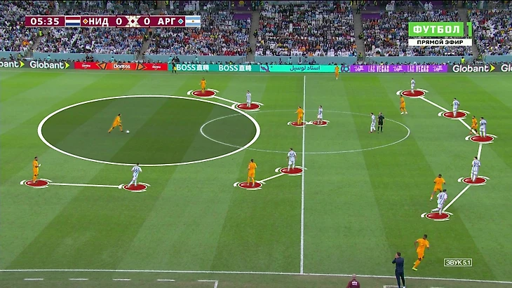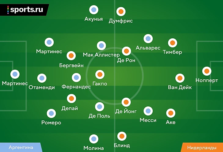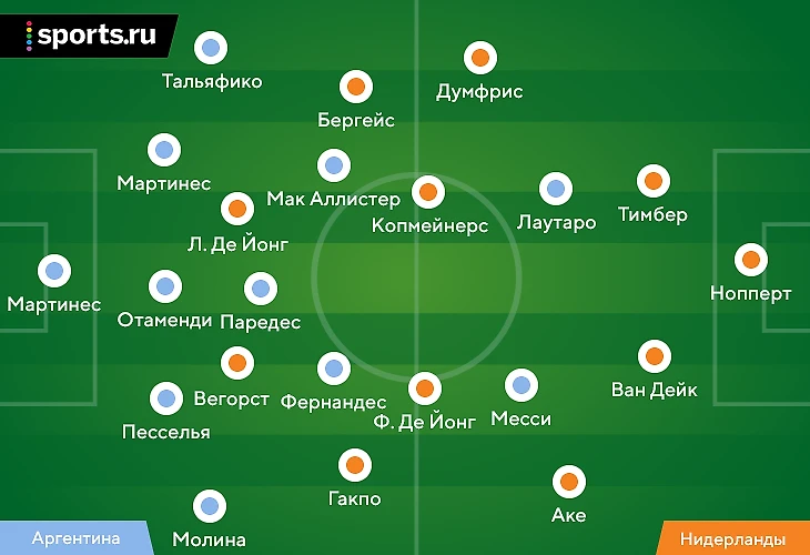 Состав ЛВГ тоже можно было считать более осторожным – тройку Гакпо, Бергвейн, Депай тренер выбирает, когда хочет больше контратаковать. Когда же Нидерланды до матча собираются владеть мячом, в полузащите выходит дополнительный игрок под комбинации и контроль (например, Дэви Классен или Стевен Бергейс). Забегая вперед, Луи выпустит Бергейса в перерыве, когда осознает, что неправильно прочитал намерение Аргентины.