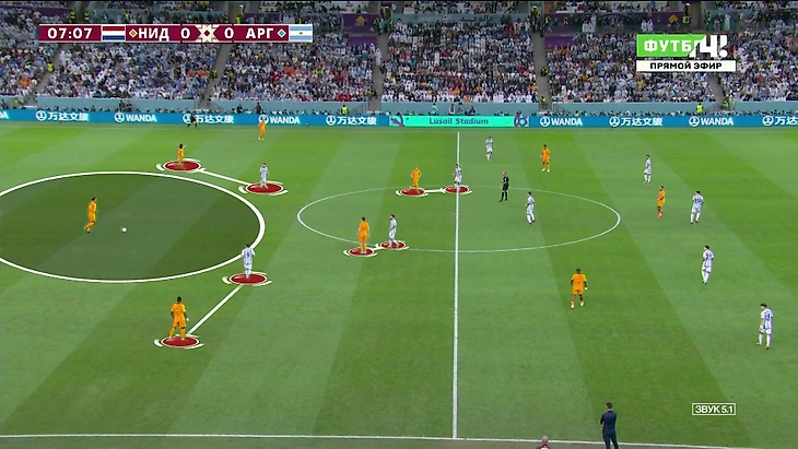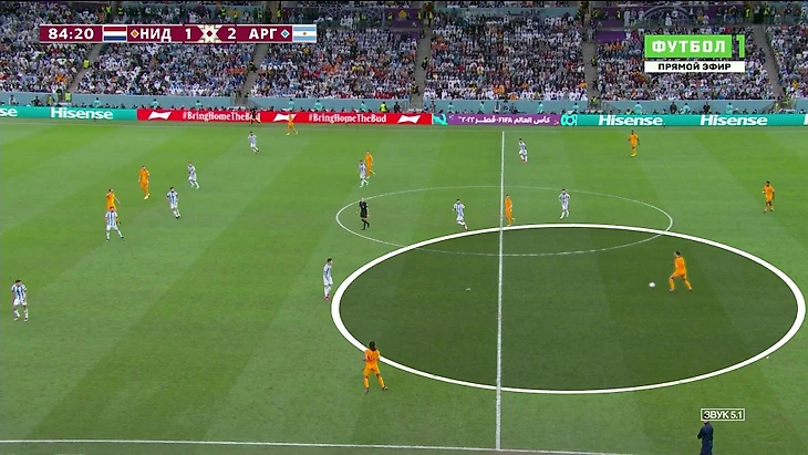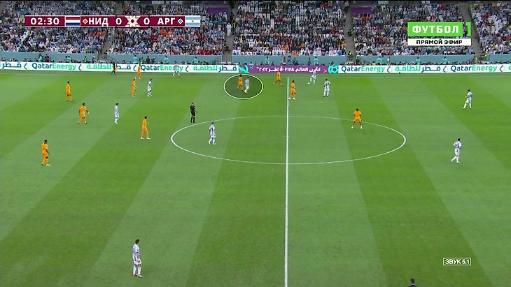 На выходе мы получили два пассивных выжидательных плана, но лучше в таком размене выглядела Аргентина. Во-первых, в сценарии, где обе команды имеют мало источников угрозы, больше почти всегда будет иметь та, за которую играет Месси. Во-вторых, Аргентине все-таки удалось вынудить Нидерланды больше владеть мячом (57% по итогам тайма).