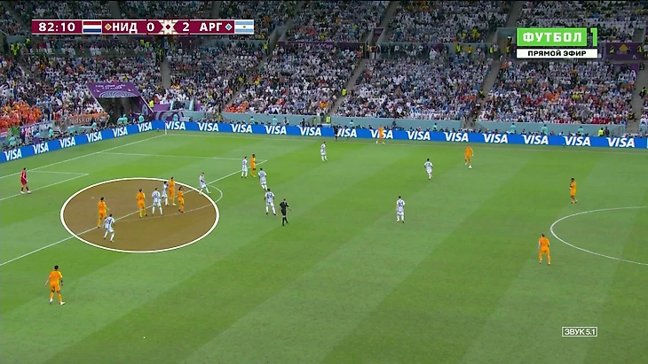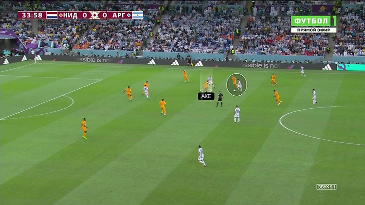 Второй – легкая зона для выхода в атаку. Левый фланг (правый для Аргентины), где Месси не оказывал никакого давления (он играл так весь матч – и проблемы не было, но теперь у Нидерландов было четкое понимание, что делать с мячом в его зоне). Можно было без пауз выходить в атаку через эту зону и нагнетать давление. Сам факт наличия такого пространства помог сделать давление непрерывным. Ван Дейк и Аке продвигали мяч и помогали закрепиться на чужой трети, откуда следовали обострения.