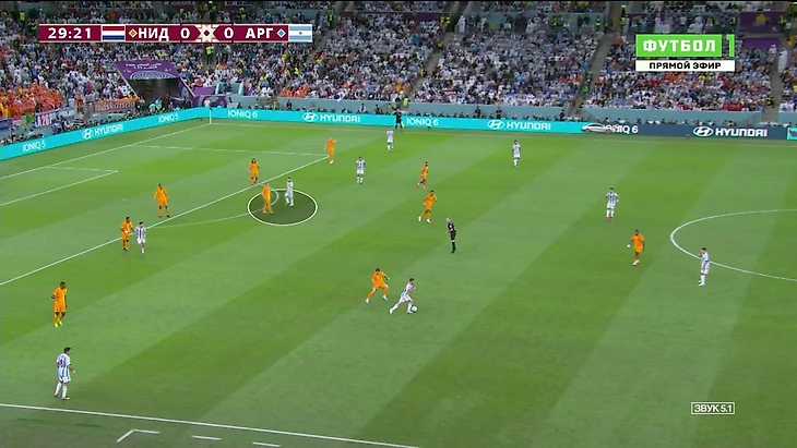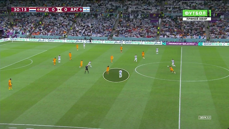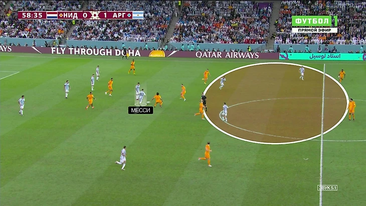 Лео было развернут к воротам, а цельной линии из пяти человек у Нидерландов не было. Расстояния в линии защиты все равно было минимальными, но Месси разрезал именно в зону между левым и центральным защитником:
