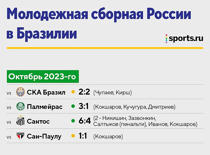 – В августе мы с [руководителем департамента сборных] Андреем Лексаковым приехали в Санкт-Петербург, – рассказывает Sports.ru главный тренер сборной России U21 Иван Шабаров. – Нас познакомили с человеком, который организовал поездку в Бразилию для нашего 2006 года, а также привез на турнир памяти Ю. А. Морозова бразильские клубы [«Сантос» и «Интернасьонал»].