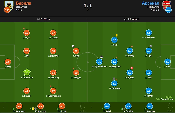 Крайняя неуверенность "канониров" в обороне и пропущенный гол тому подтверждение. Кстати, все камни полетели в Джаку и можно понять почему, но каким образом Лено сего миновал — загадка века. Пассовать под прессинг в собственной штрафной — такая себе затея, если честно. Короче, команда Артеты прекрасно понимала, что уйти в атаку полностью не получится, так как Бернли в любой момент могут быстро контратаковать, посему часть центральных полузащитников была вынуждена страховать оборону.