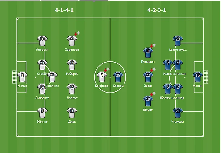 Вместо привычных трех защитников вышло четыре, а вместо Вернера и Жиру играл Хаверц. Действительно, данная схема еще не была опробована в деле, посему к чему такой риск, а еще и на выезде — непонятно. Да, Хаверц играл ложного нападающего в полностью гибкой линии атаки, где Маунт, Зиеш и Пулишич были свободными игроками оттяжки, сменяя друг друга, но это решение изначально лишило лондонцев прямого забивалы, который мог вколотить мяч в сетку даже в полумоменте.