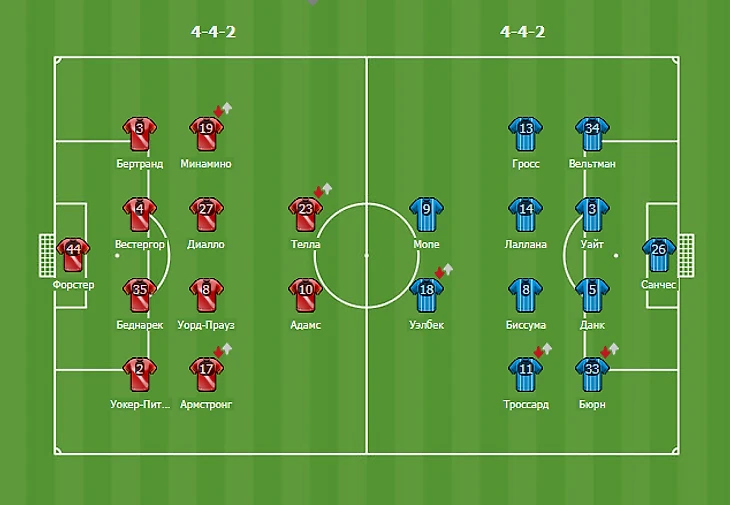 В целом игра была на средних скоростях и с моментами, правда, достаточно условными и неявными. Брайтон не несся на соперника, как это бывает обычно, а решил спокойно додержать преимущество, и правильно сделал.