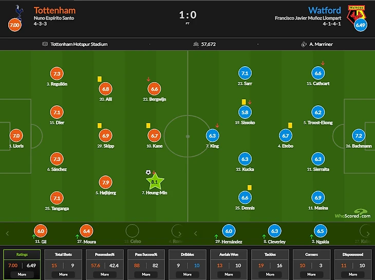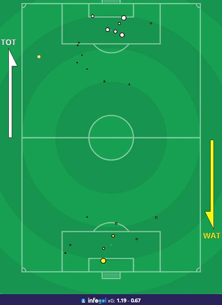 "Шершни", выдав отличный матч в первом туре, не могут въехать в колею после. Уотфорд столкнулся с очень крепкой и выдрессированной обороной Тоттенхэма, которую проходить практически не удавалось. Единственный момент, который действительно запомнился — удар Сарра в защитника в начале второго тайма.