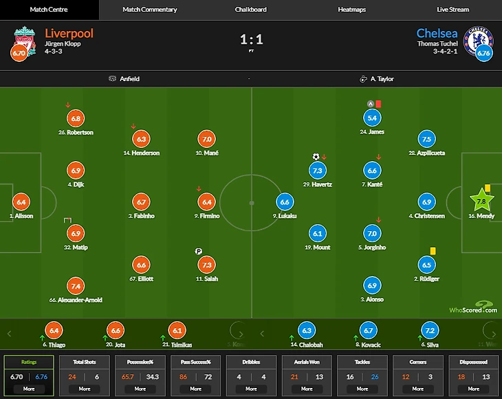 Мне тяжело зацепиться за какой-то момент, кроме удара Жоты головой с подачи Салаха и удара слета Робертсона. Дальние шоты Дейка и Фабиньо полностью контролировались Менди, а позиционные атаки совсем уж не клеились.