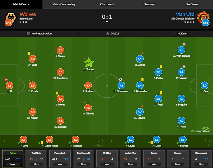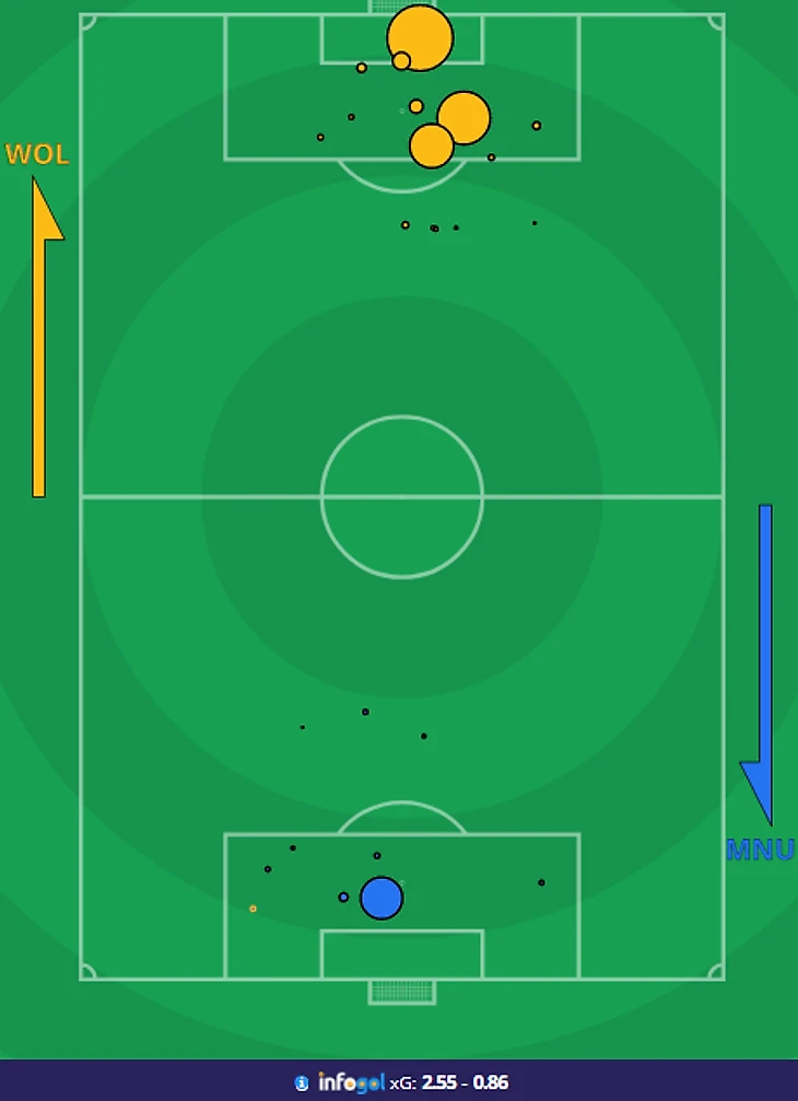 Даже несмотря на относительно открытую игру Вулвз на протяжении всей игры, у Юнайтед не удавалось ловить их хотя бы на контратаках. Про позиционные атаки сказать толком и нечего: все попытки комбинировать и доставлять мяч в штрафную умирали в зародыше. Джеймс провел настолько плохой матч, что грустить его трансферу в Лидс нельзя: Дэн не может ничего, кроме как пробежать с мячом по флангу, а потом его либо потерять, либо дать неточную передачу. Игру Санчо комментировать не стоит, поскольку пока что мы видим совсем не готового для АПЛ футболиста, который ничем не помогает команде, если не мешает вовсе.