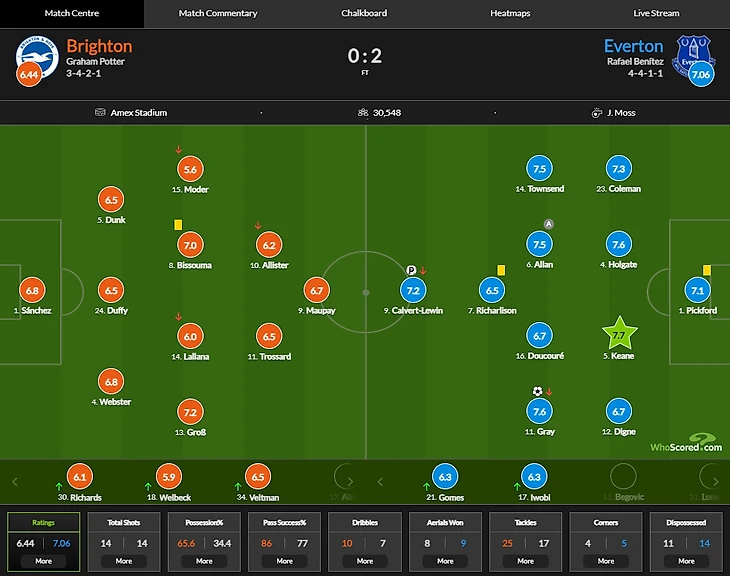 В этот раз Поттер решил сыграть без экспериментов, не рискнув выпустить новоприобретенного Мвепу даже со скамейки. Схема весьма привычна для прошлого сезона, а вот Уайта обороне "чаек" явно не достает: Эвертон умело разрезал оборону длинным передачами. Команда Бенитеса старалась играть в достаточно открытый контратакующий футбол, чему я, если честно, был сильно удивлен. "Ириски" весьма охотно расставались с мячом, умело отбиваясь от посредственных нападок Брайтона.