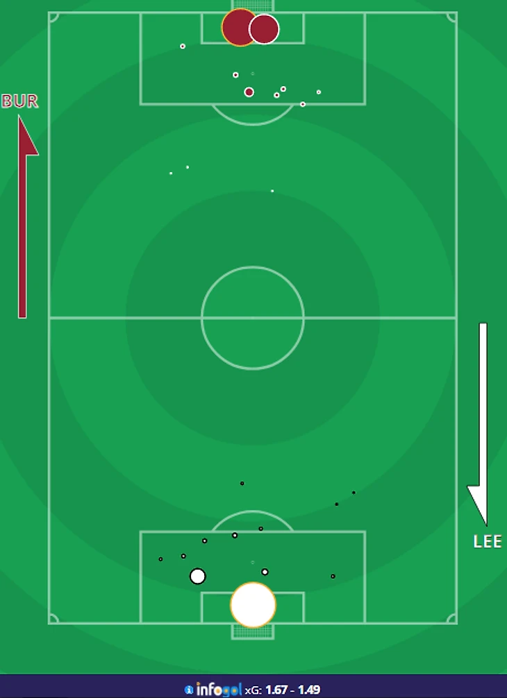"Кларетовые" выглядели куда мощнее и увереннее в этой игре. Команда периодически шла вперед всеми силами, оказывая огромное давление на оборону соперников: в штрафной Лидса часто оказывался тот же Ми или Лоутон. Это не говоря про стандарты, поскольку Тарковски в этом матче чуть не забил головой на угловом, но угодил в крестовину.