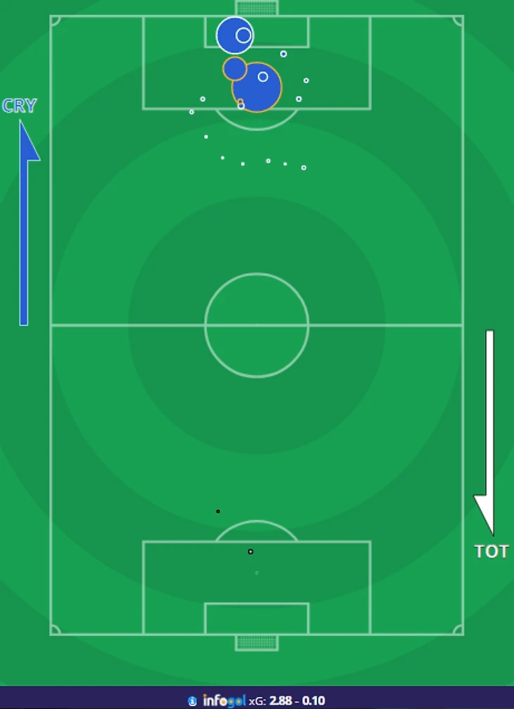 "Шпоры" ударили по воротам 2 раза (у КП 18), попав в створ 1 (у КП 4). Ни единого даже полуопасного момента изобрести Тоттенхэму не удалось, а защита команды оказалась совершенного не готовой к индивидуально сильным качествам команды Виейры.
