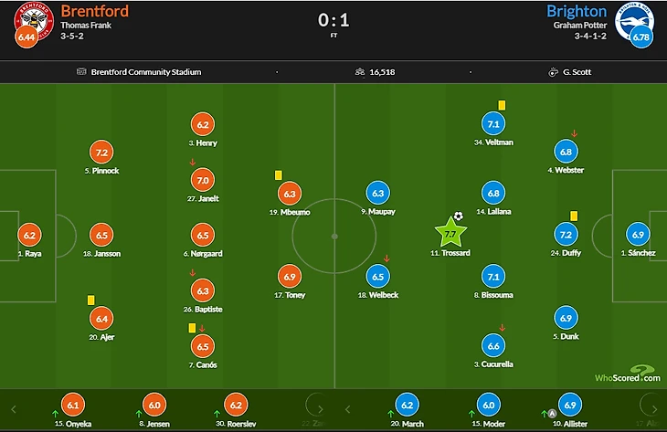К слову: "пчелы" не выглядели плохо в этом состязании, но подбор исполнителей все же не позволяет играть гибко или же трансформировать изначальный план встречи по ее ходу. Тоуни, пожалуй, был главным обостряющим компонентом Брентфорда, но Мбемо крайне неудачно реализовал все то небольшое количество остроты у ворот Санчеса.