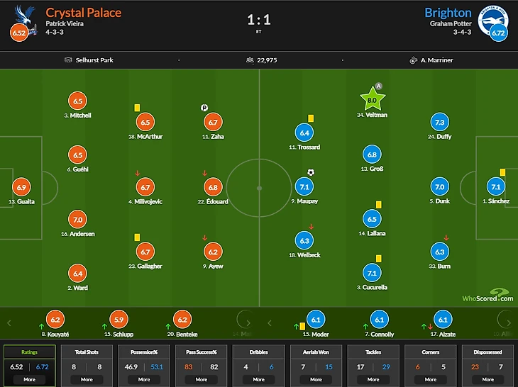 В целом, матч был совсем небогат на моменты, и виной этому Грэм Поттер и никто иной. Чайки настолько стали проще в своем футболе, что отличить их от Кристал Пэлас Ходжсона или Ньюкасла практически нереально. Все миловидные комбинации и наглый контроль мяча с быстрым пасом нивелировались, став абсолютно обыденным английским футболом.