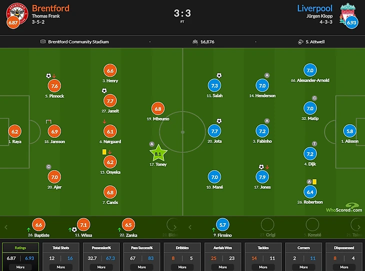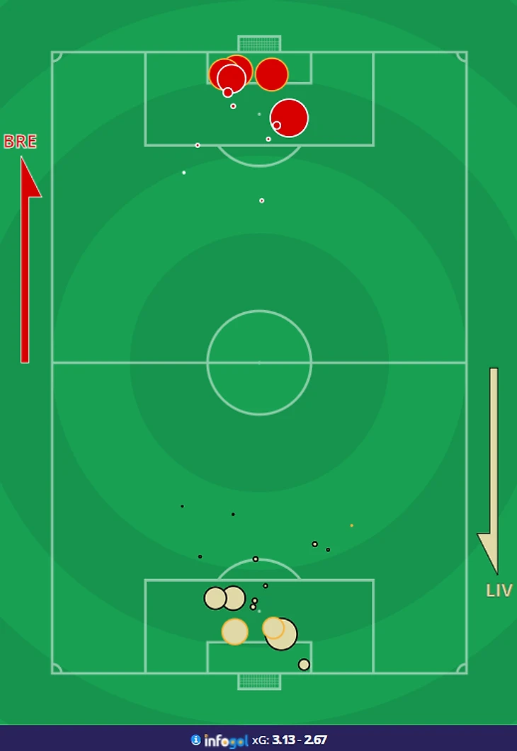 Прессинг, кстати, тоже сыграл большую роль в этом матче. Разумеется, тягаться в этом с командами Клоппа более, чем просто глупо (PPDA 6,71 — Ливерпуль; 23,7 — Брентфорд), но сам замысел коуча "пчел", предполагаю, был в другом: Ливерпуль не должен был продолжительное время чувствовать себя комфортно. Думаю, с этой задачей Брентфорд явно справился.